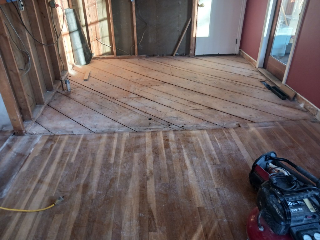 Wove new white oak flooring into existing floor to make one!